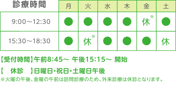 受付時間:初診の方は午前は11:30まで、午後は17:30まで